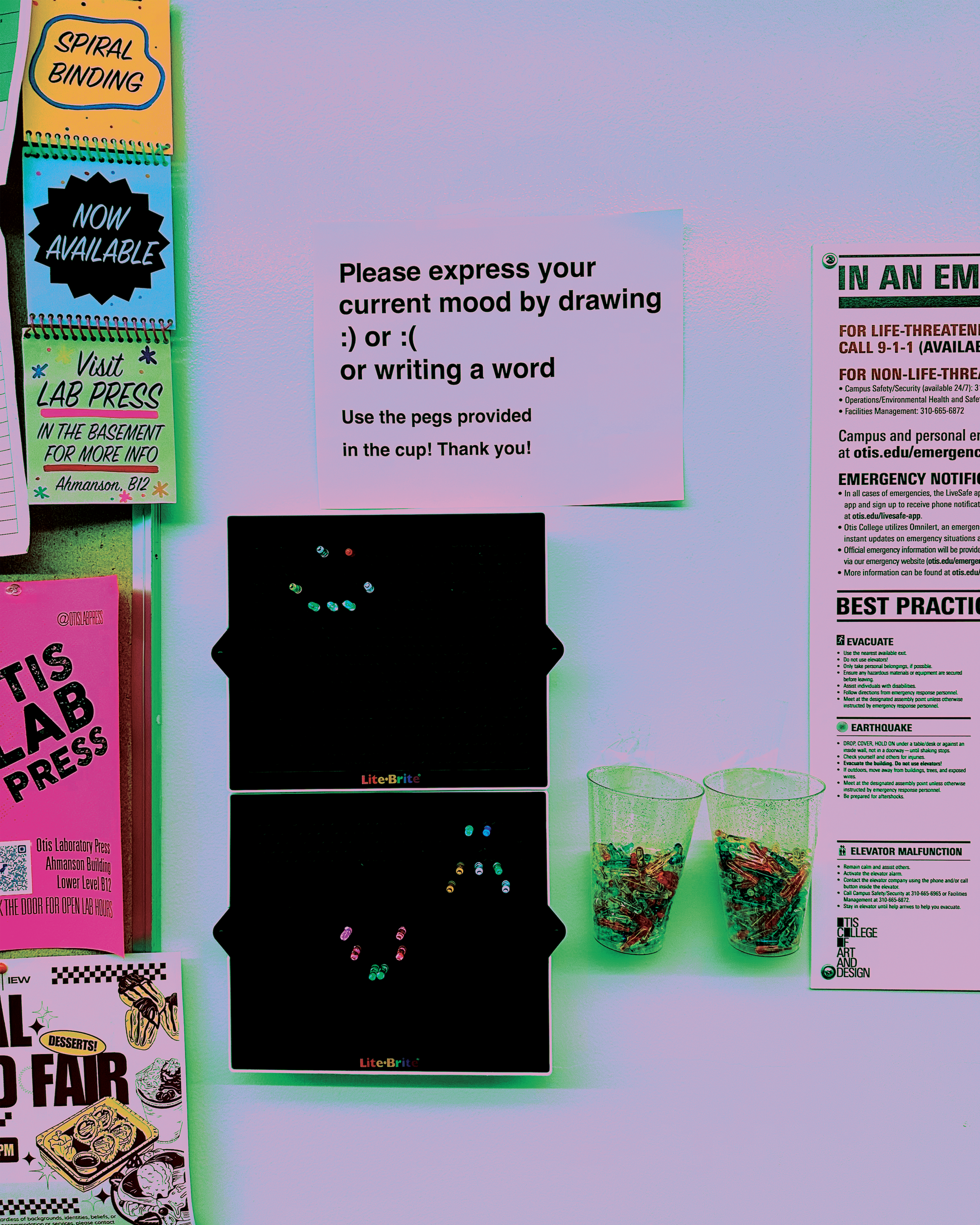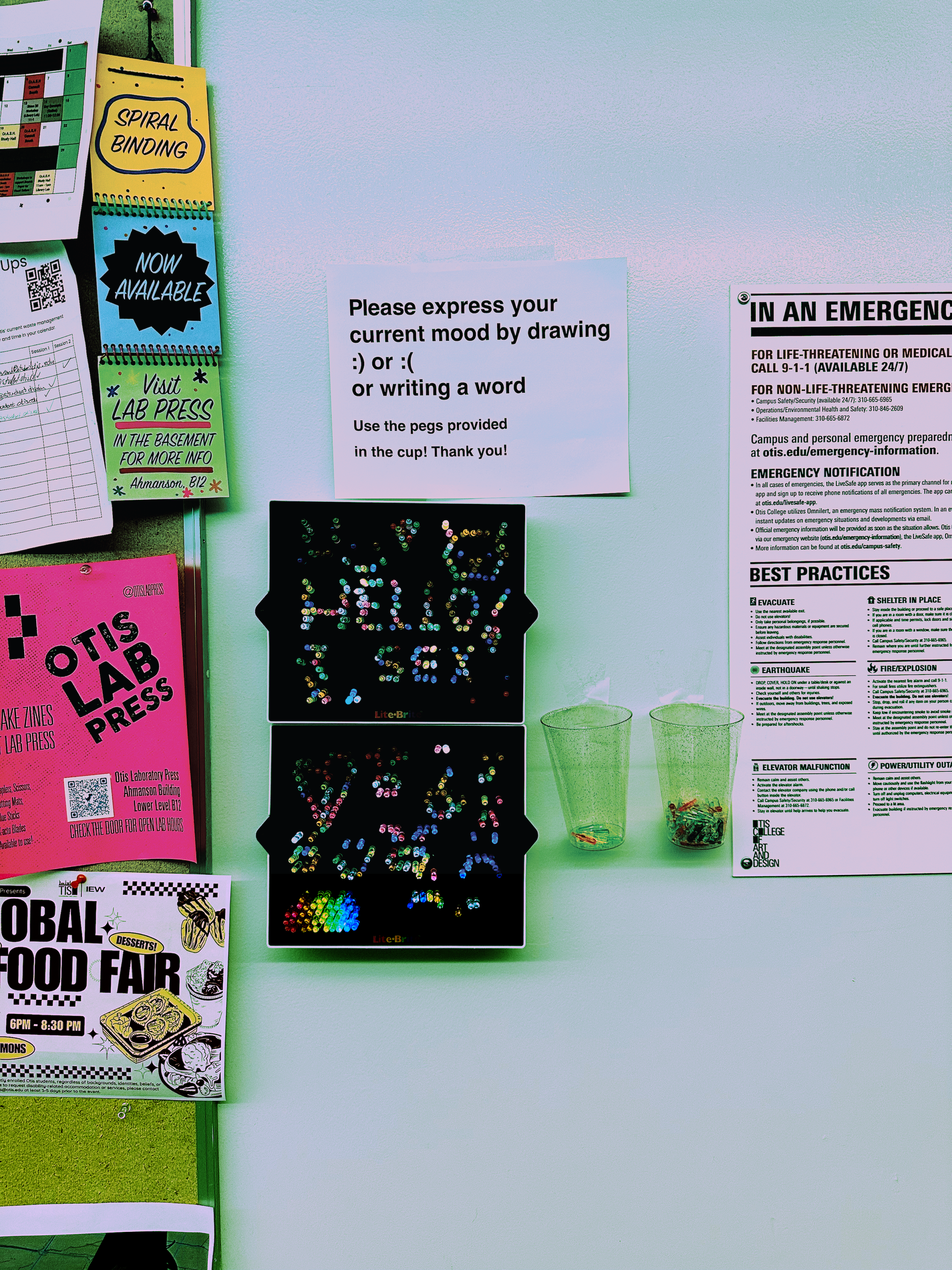 Two Lite Brite boards pinned up on a wall with local foot traffic. A prompt asking viewers to use the Lite Brite pegs to express their mood.